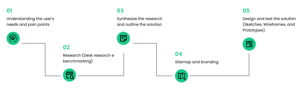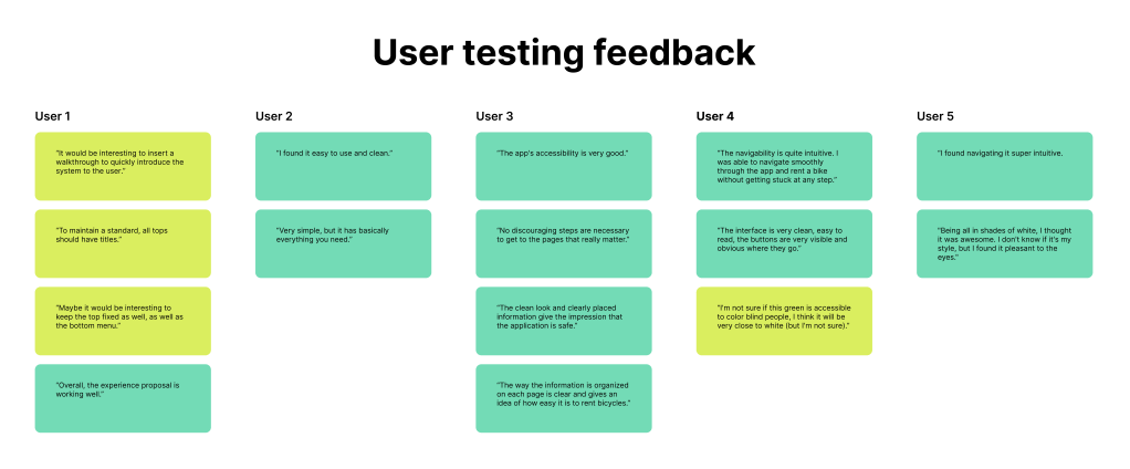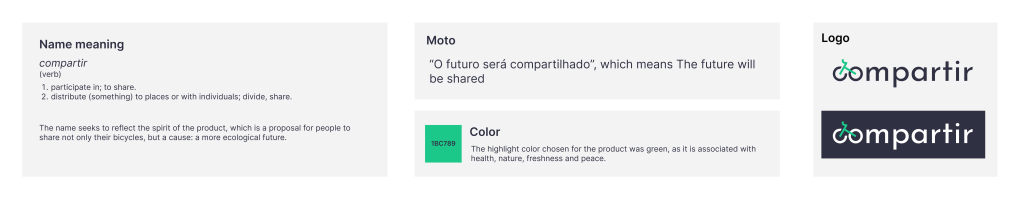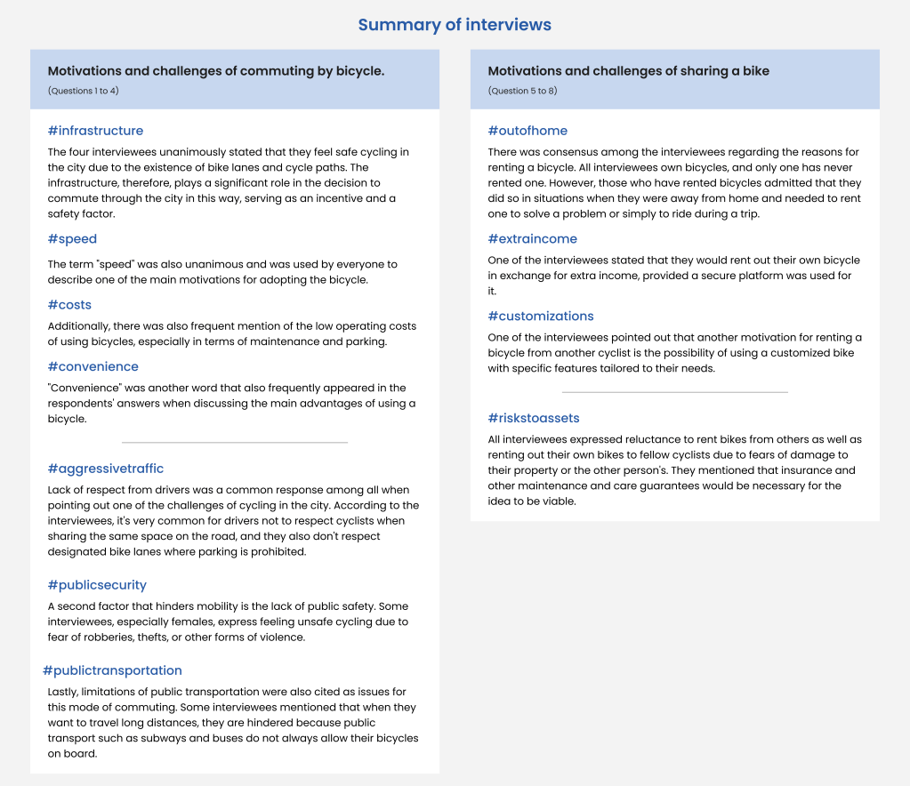 The matrix helped formulate questions that guided the next stage of the process: user research. Based on it, we defined 8 questions to be answered by the interviewed users. These questions were centered around two main axes: motivations and challenges of cycling; motivations and challenges of bike-sharing. We interviewed 4 people living in São Paulo who either currently or previously commuted by bicycle in the city. The result of these interviews was synthesized into keywords, summarizing the main points that emerged from the respondents’ statements. This phase was crucial to understand that one of the pain points that needed to be addressed was the issue of safety; therefore, the solution needed to offer insurance to the users.