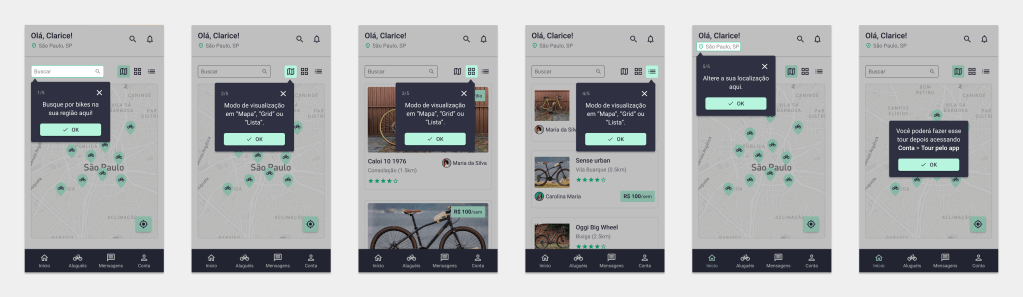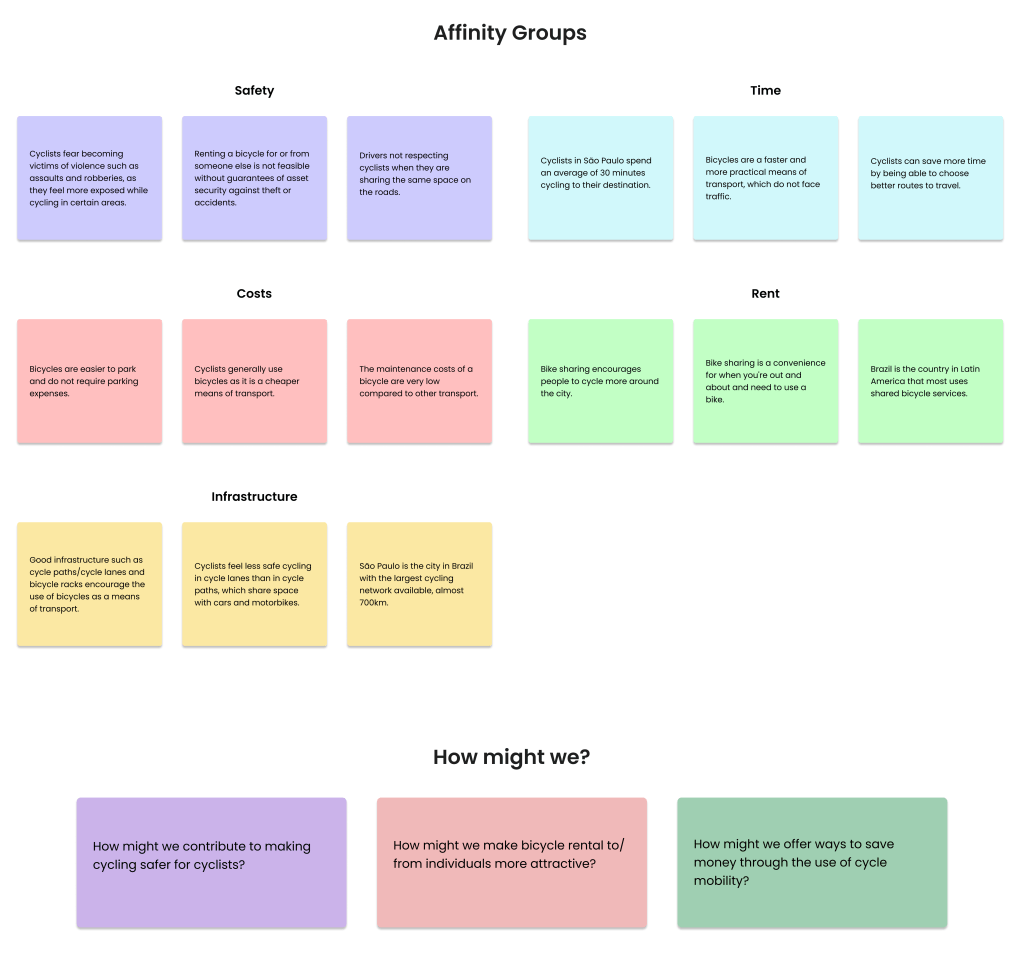 In parallel with the interviews, we also conducted desk research. Data were collected about the city’s cycling infrastructure, such as the size of the cycling network and the availability of bike racks and bike parking facilities. We also gathered socioeconomic data to understand who the people cycling in São Paulo are and why they do so. Finally, we collected some data from the largest bike-sharing service available in the country to understand the current scenario of this type of service. Additionally, we conducted benchmarking to understand the existing companies in the market and what they offer. After the research phase, we synthesized all the gathered data using two methodologies: How might we (HMW) and Affinity Grouping. Then, we brainstormed ideas and finally arrived at a solution outline.