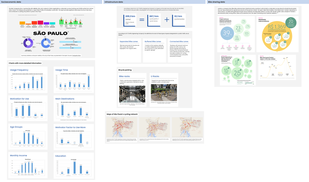 In parallel with the interviews, we also conducted desk research. Data were collected about the city’s cycling infrastructure, such as the size of the cycling network and the availability of bike racks and bike parking facilities. We also gathered socioeconomic data to understand who the people cycling in São Paulo are and why they do so. Finally, we collected some data from the country’s largest bike-sharing service to understand the current landscape of this type of service. We also conducted benchmarking to understand the existing companies in the market and what they offer.