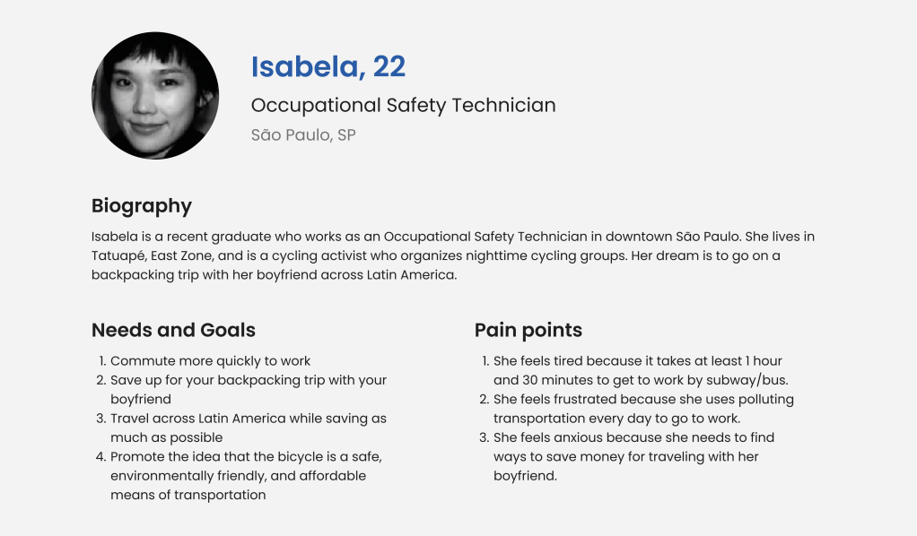 The solution aims to address, in a balanced manner, our users’ two main needs: saving time and money while commuting from home to work and promoting cycling as a viable option for the city of São Paulo. Our users are young cyclists from this city who wish to commute faster to work, but also believe that the bicycle is an environmentally friendly mode of transportation that needs to be more valued. We started from the specific needs of our defined persona to offer a solution that allows, at the same time, saving/earning money with the bike and connecting with other people who want to promote cycling.