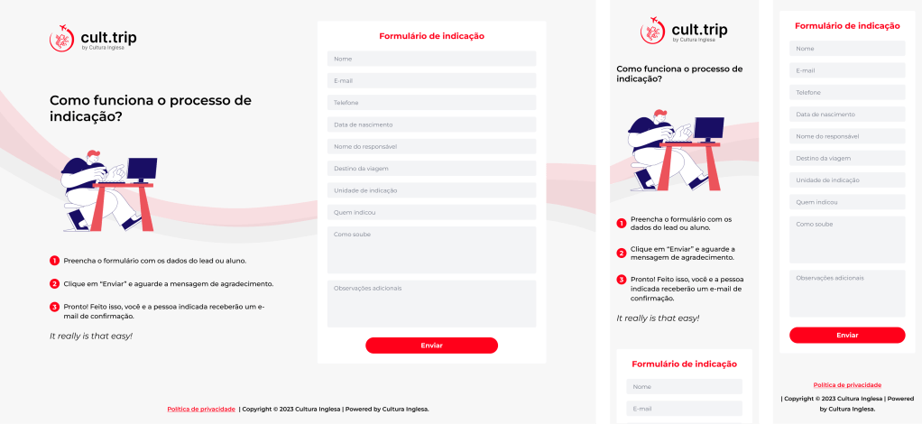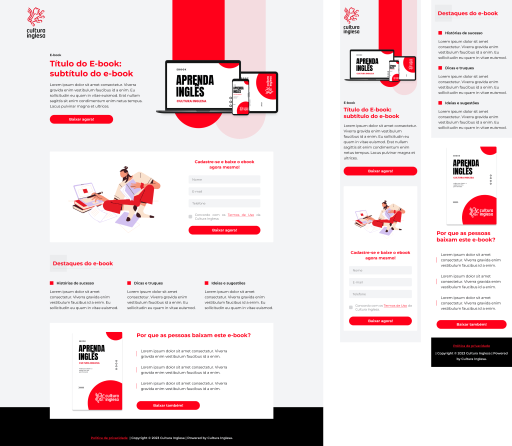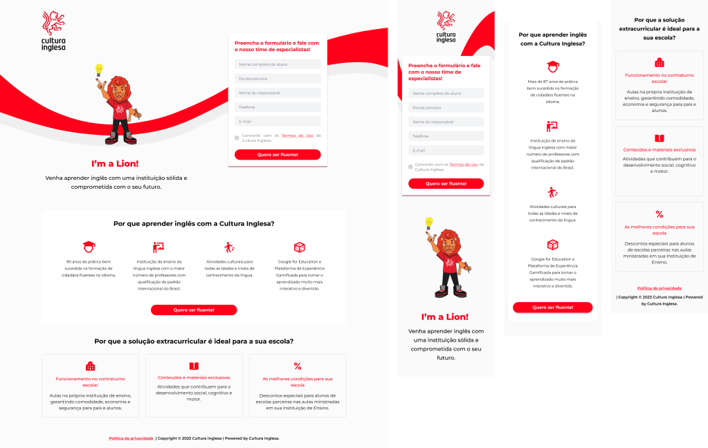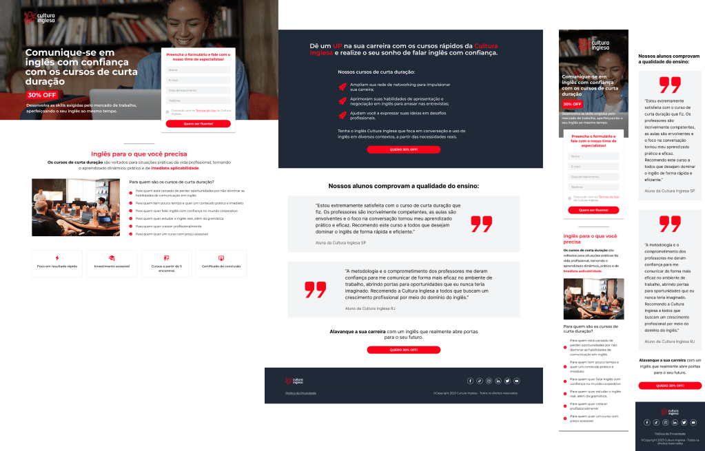 These landing pages were created as part of my job as a UX Designer at Cultura Inglesa. They are meant to generate leads for the company, which is an English course school. Their primary goal is to sell courses and exams such as Cambridge and TOEFL. My stakeholders in this role were the marketing team. Usually, they approached me with requests for landing pages, either to redesign an existing one or to create a new one. In response, I am responsible for brainstorming ideas and coming up with designs. Sometimes, I only have some days to prototype and complete the task. Therefore, the designs are kept relatively simple, involving elements like texts, icons, cards, and a form.