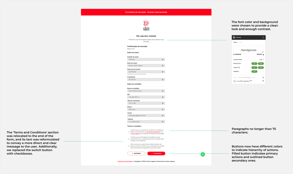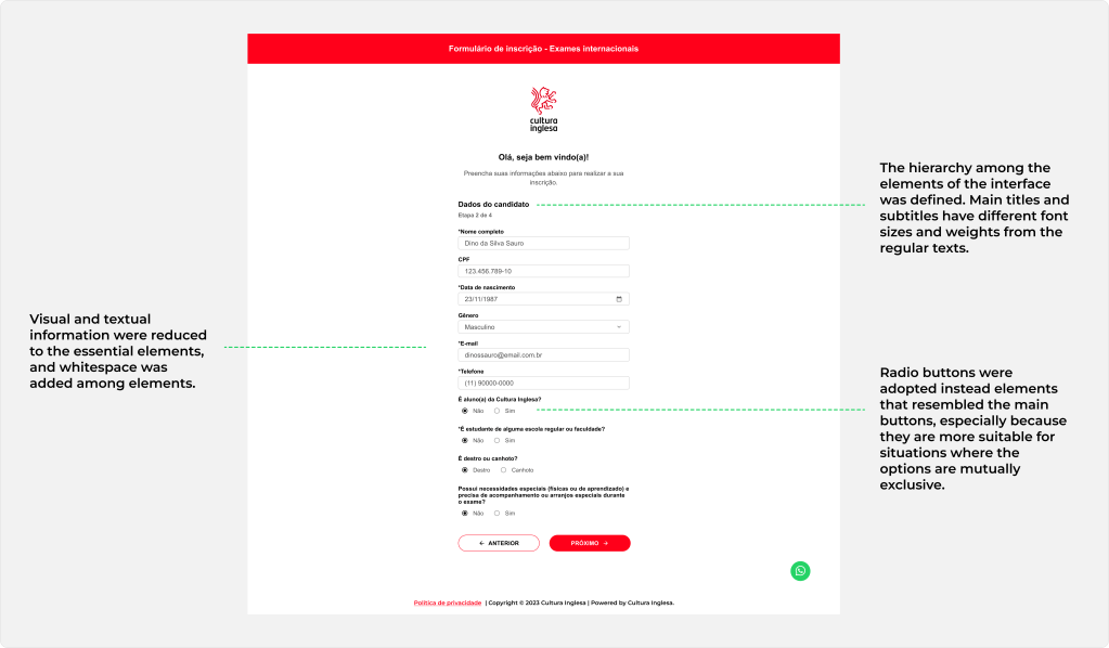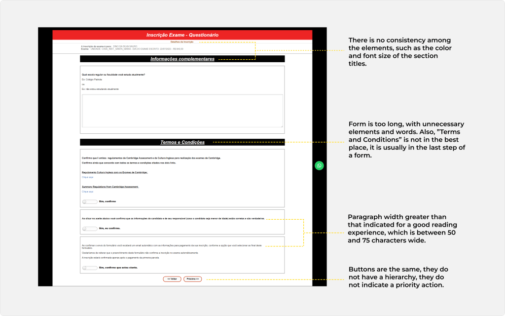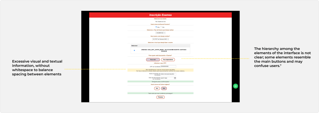 During my time at Cultura Inglesa, I had the opportunity to work on a quick redesign project for the form used by users to register for certification exams such as Cambridge, TOEFL, IELTS, etc. It was a simple web form that needed to be redesigned in a short time to be available to students in time for the enrollment period.